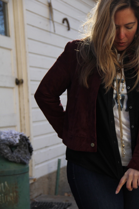 Oh. It has turned mighty chilly here in Minnesota. So I brave the outdoors with a new purchase. Oxblood suede jacket. The deep, beautiful, and quite popular color of the fall season. I can't believe that this jacket was on sale in a consignment shop here in Minneapolis. It was even marked down. Its suede! The label is Inc.